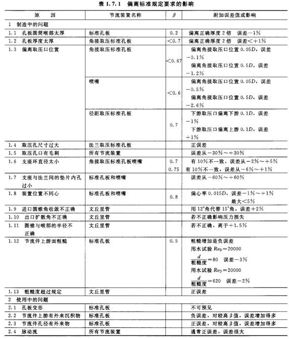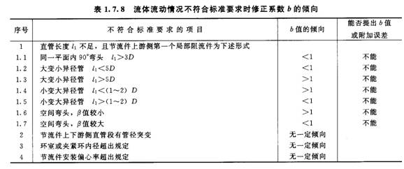 當(dāng)節(jié)流件上游側(cè)直管段長(zhǎng)度不符標(biāo)準(zhǔn)規(guī)定時(shí),流出系數(shù)將發(fā)生變化。表1.7.6及表1.7.7列舉若干流出系數(shù)偏差的估算值及其附加不確定度。