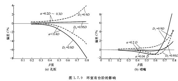 環(huán)室內(nèi)徑小于管道內(nèi)徑,如圖1.7.8所示,將產(chǎn)生大的測(cè)量誤差。圖1.7.9所示為環(huán)室產(chǎn)生臺(tái)階時(shí)流出系數(shù)的偏差影響。