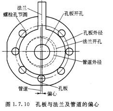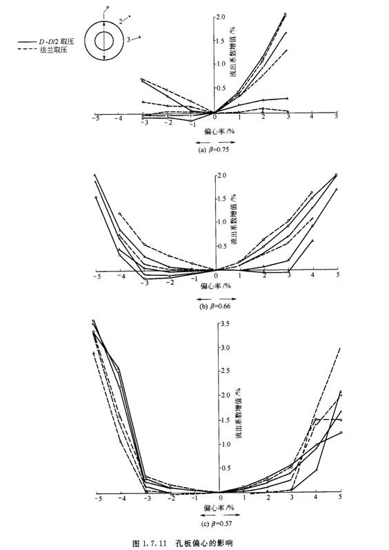 圖1.7.10所示為節(jié)流開孔軸線與法蘭內(nèi)圓軸線及管道軸線之間的偏心圖形。偏心率對(duì)流出系數(shù)的影響與B值、取壓方式、偏心方向等有關(guān),如圖1.7.11所示。 自