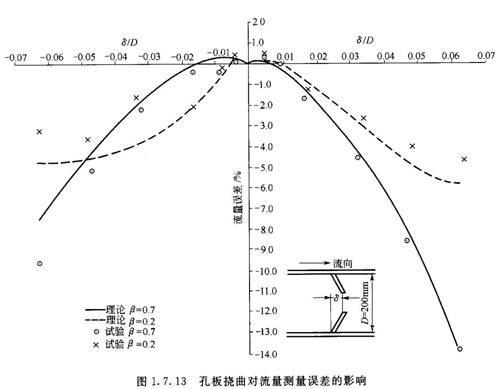 圖1.7.13所示為孔板撓曲對(duì)流量測(cè)量誤差的影響。造成孔板撓曲的原因可能有制造質(zhì)量差,安裝產(chǎn)生應(yīng)力或大差壓造成的等等。