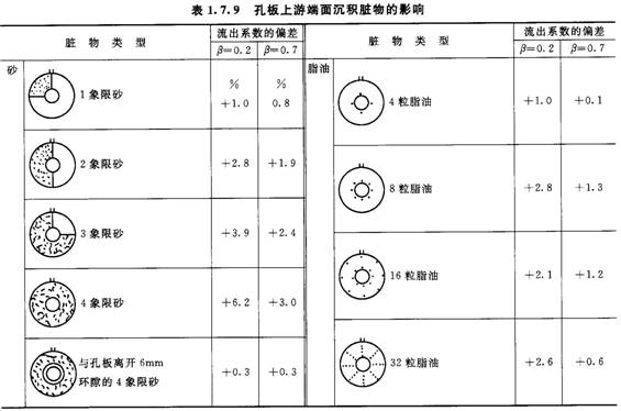 表1.7.9所示為孔板上游端面沉積臟物對(duì)流出系數(shù)的影響。砂粒顆粒尺寸為O.4mm,脂油污點(diǎn)的直徑為6.3mm,厚為2.5mm,孔板裝于DN100測(cè)量管內(nèi),測(cè)量大氣壓下的空氣。由圖可見,孔板入口處環(huán)狀區(qū)域的情況很重要,它對(duì)測(cè)量誤差的影響起主要作用。