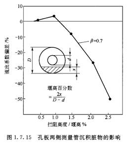 圖1.7.14和圖1.7.15所示為孔板上游側(cè)測(cè)量管底部沉積臟物對(duì)流出系數(shù)的影響。
