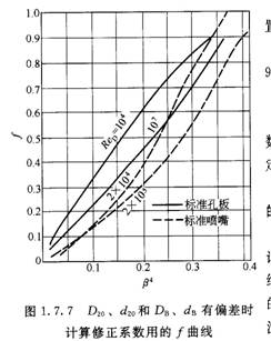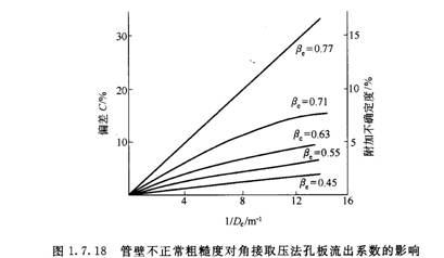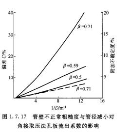 1.角接取壓標(biāo)準(zhǔn)孔板在糙管中流出系數(shù)的變化圖1.7.17和圖1.7.18所示為角接取壓標(biāo)準(zhǔn)孔板在糙管中流出系數(shù)的變化。圖1.7.17所示管壁條件為:管壁結(jié)垢為球形瘤,平均尺寸為6.3mm,亦就是管道內(nèi)徑有效值減少約6.3mm。 因中虛線B=0.71是經(jīng)砂磨表面,顆粒約O.5~1.Omm。圖1.7.18所示的管壁條件顆粒尺寸約1mm多,即約為圖1.7.17所示的1/3。
