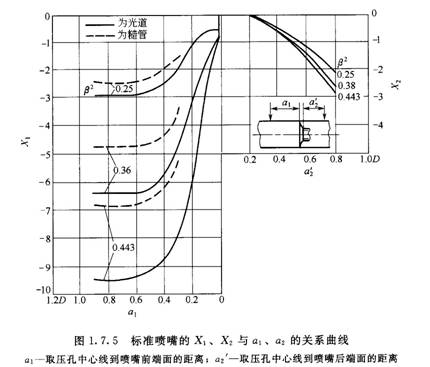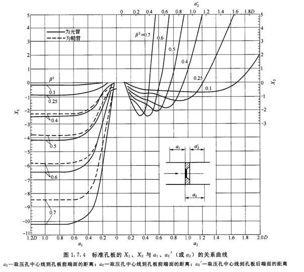 式中Xl和X2與al和a2'(a2)有關(guān)。角接取壓標(biāo)準(zhǔn)孔板和標(biāo)準(zhǔn)噴嘴的Xl和X2值是不同的,如圖1.7.4和圖1.7.5所示。