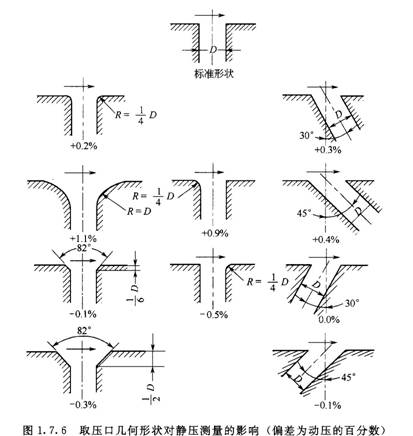 取壓口有毛刺或沉積污物會(huì)引起誤差,特別在流速較高處,如噴嘴和文丘里管的喉部,將引起很大的誤差,角接取壓口在流動(dòng)的滯止區(qū),因此影響稍小些。取壓口幾何形狀對(duì)靜壓測(cè)量的影響如圖1.7.6所示。其偏差為動(dòng)壓的百分?jǐn)?shù)。