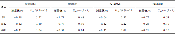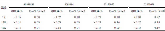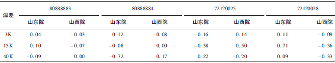 (1)熱量相對示值誤差測量結果中,兩院在15K點處與參考值的差值最大,山東院為+0.17K(72120028);山西院為+0.13K(72120025)。由于3K溫差對相對誤差來說要求較高,所以差值的擴展不確定度也較大,為0.63%~0.81%。
