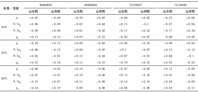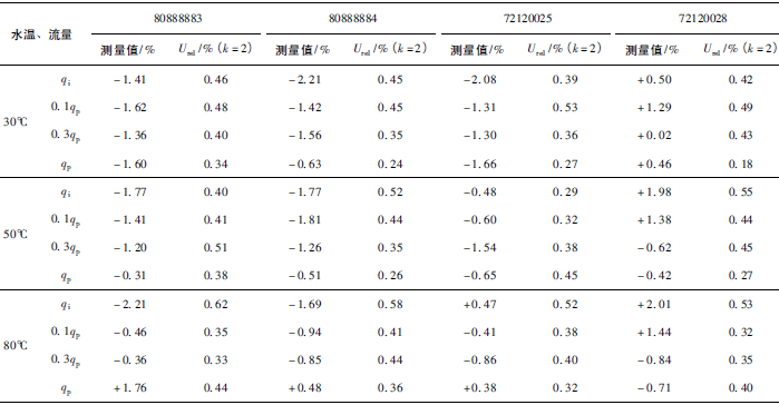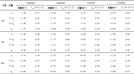 (3)累積體積(標準表法)相對示值誤差測量結果中,山東院在水溫30℃、qi點處與參考值的差值最大,為+0.31%(80888883);山西院在水溫80℃、qp點處與參考值的差值最大,為-0.24%(72120028)。同樣在標準表法中比對樣品在一些試驗點上的測量重復性也不是很好,差值的擴展不確定度最大達到了1.41%。
