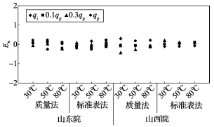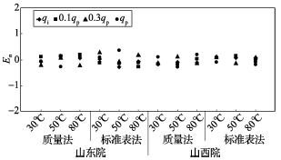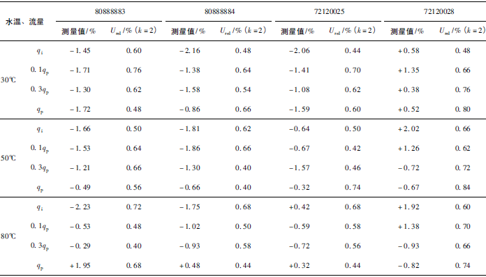 (2)累積體積(質量法)相對示值誤差測量結果中,山東院在水溫80℃、qi點處與參考值的差值最大,為+0.31%(72120025);山西院在水溫30℃、0.3qp點處與參考值的差值最大,為+0.36%(72120028)。由于比對樣品在一些試驗點上的測量重復性不是很好,差值的擴展不確定度最大達到了1.35%。