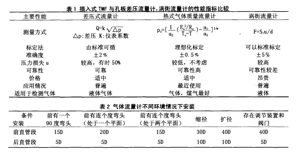 5大管徑流量儀表的比較插入式TMF、孔板式差壓流量計兩者均能檢測 大管徑流量 ,我們可以作一 比較 ,由表i中明顯看出大管徑插入式熱式氣體質量流量計在各項性能 指標有很大的優勢,因此它是差壓式流量計的替代品。氣體流量計根據具體的環境情況的安裝見表 2。