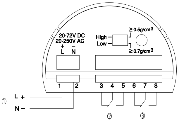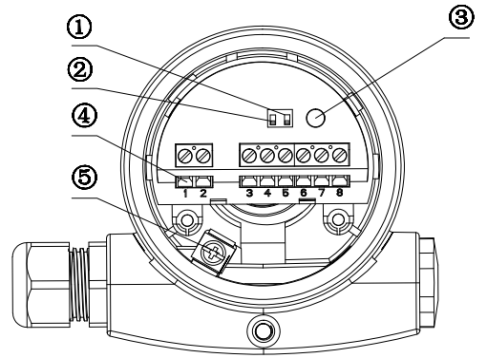 ①密度開關 ② 高低位模式 ③ 指示燈 ④ 接線端子 ⑤ 接地端子