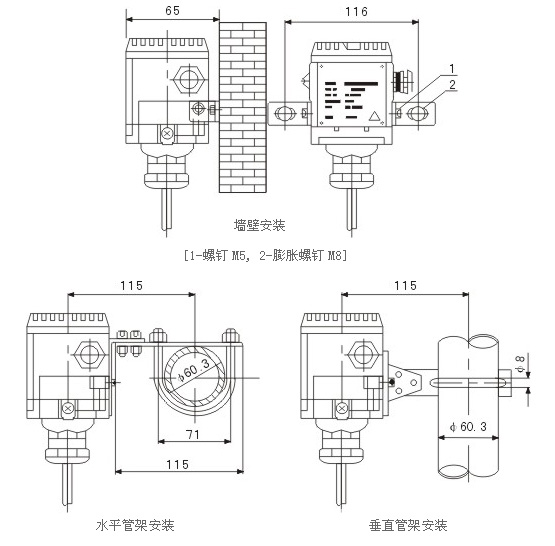 LK-LC/LR型投入式液位計變送器具有多種安裝固定方式,以適應(yīng)不同現(xiàn)場情況。當(dāng)現(xiàn)場不能夠提供G2的內(nèi)螺紋或法蘭等工藝設(shè)施時,可選擇普通形式的液位變送器,它有墻壁安裝式、水平管架式和垂直管架式等叁種安裝方式可選擇,使您在現(xiàn)場安裝時得心應(yīng)手。