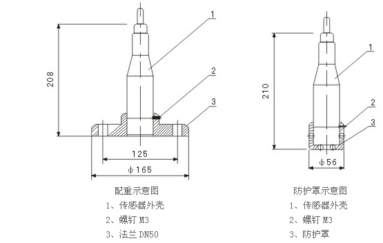 在測量流動性較大的介質(zhì)時,為防止傳感器劇烈擺動,用戶可選用配重附件,以起到穩(wěn)定傳感器的作用。配重以法蘭形式提供(DN50、PN4.0MPa、GB116.7-88),用戶可以用螺栓將其固定于工藝設(shè)施。